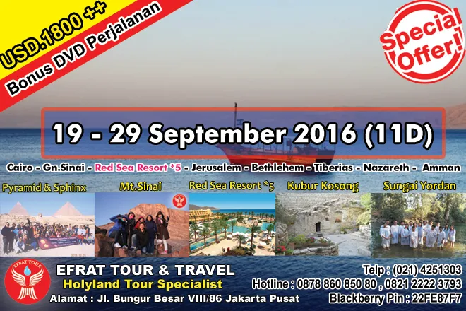 PROGRAM HOLYLAND 19-29 September 2016 (11 Hari) Mengunjungi : Cairo - Sinai - Red Sea 5* Resort Jerusalem - Bethlehem - Dead Sea - Tiberias - Nazareth - Amman Program: “PYRAMID & SPHINX,Berlayar di Danau Galilea, Western Tunnel (Terowongan Bait Allah), 'Peneguhan Pernikahan di Gereja Kana ', 'Sungai Yordan”, Pembimbing Rohani : Ps.Ivan Sitompul Bonus DVD Perjalanan