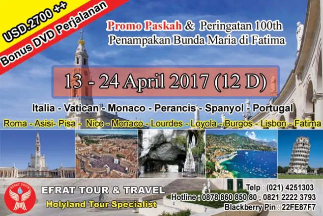 Ziarah Eropa PROMO Paskah & Memperingati 100th Penampakan Bunda Maria di Fatima Tri Hari Suci di Roma Italia – Vatican – Perancis – Monaco – Spanyol - Portugal Roma - Asisi - Pisa - Monaco - Nice - Lourdes - Loyola - Burgos - Fatima - Lisbon Mengunjungi : Cova da Iria tempat Bunda Maria menampakan diri pada th.1917, Lourdes tempat Bunda Maria menampakan diri pada St.Bernadette serta terkenal dengan air suci dan prosesi Jalan Salibnya, Menara Miring Pisa, Vatikan- Basilika Santo Petrus, dll.. 13 – 24 April 2017 (12 Hari) Didampingi Romo Pembimbing Rohani Bonus DVD Perjalanan