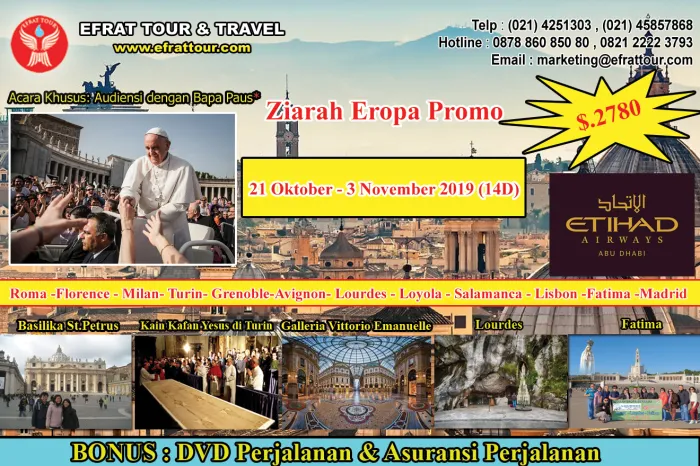 Ziarah Eropa Lengkap 14 HARI by ETIHAD AIRWAYS HANYA UNTUK 30 ORANG MAXIMAL dalam 1 Group Italia - Vatican - Perancis - Portugal - Spanyol Roma - Florence - Milan - Turin - Grenoble - Avignon - Lourdes - Loyola - Salamanca - Fatima - Madrid Highlight : "AUDIENSI DENGAN BAPA PAUS","MELIHAT KAIN KAFAN YESUS DI TURIN", "JALAN SALIB & MANDI AIRSUCI DI LOURDES", "BERZIARAH KE FATIMA DI MANA BUNDA MARIA MENAMPAKAN DIRI SEBANYAK 6X KEPADA GEMBALA KECIL SEDERHANA" 21 Oktober - 3 November 2019 (14 Hari ) Bersama : Romo. Valentinos Kusuma, OFM HOTEL BINTANG 4 Bonus : DVD PERJALANAN & ASURANSI PERJALANAN